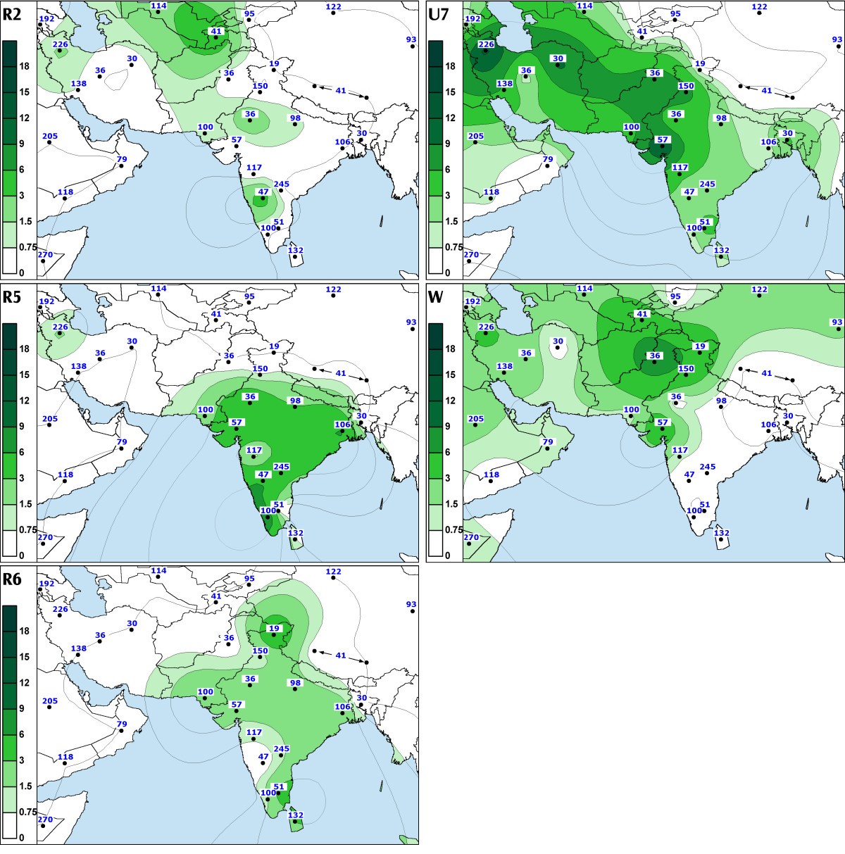 Haplogroup isofrequency maps were generated using the Kriging method in Surfer 7 program of Golden Software. Haplogroup frequencies were averaged over populations from the same state in India, provinces in China and Thailand and geographic divisions in Iran. The data points for Kriging are shown as black dots, while the sample size applicable to the data point is given adjacent to the dot. In relatively small and isolated groups (e.g. tribal groups) random genetic drift might seriously affect the haplogroup frequencies, which may become uninformative when a whole region (e.g. state) is considered (e.g. M18 among the Lodha, see below). Therefore, the tribal data were excluded from the haplogroup isofrequency maps calculation. When illustrating the spread of mtDNA haplogroups native to West Eurasia, East Eurasia and India (Figure 11, panel D) we present these data as pie diagrams. The respective sample size and origin are indicated adjacent to the diagrams.